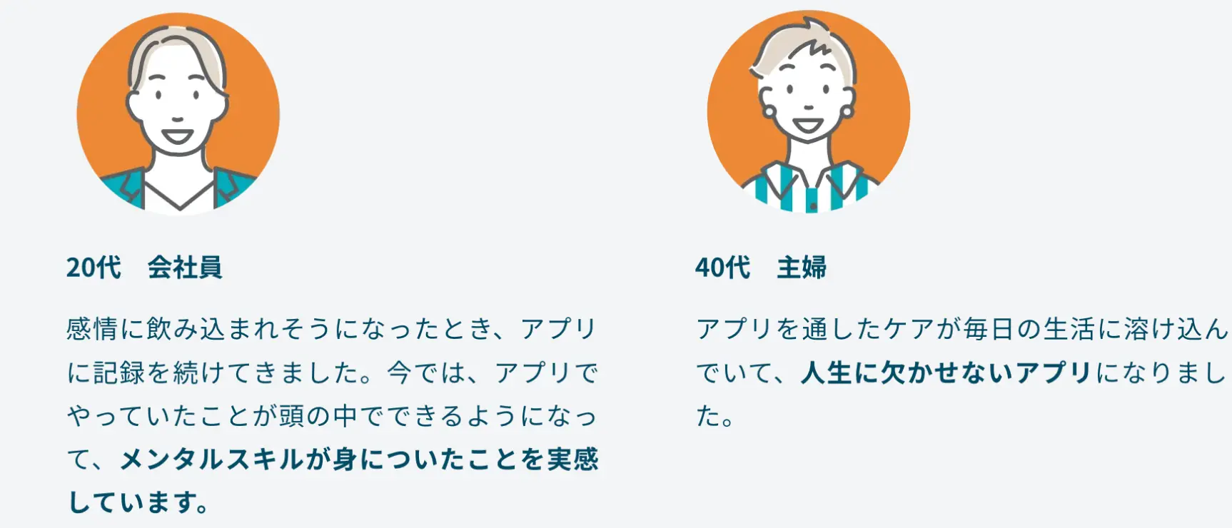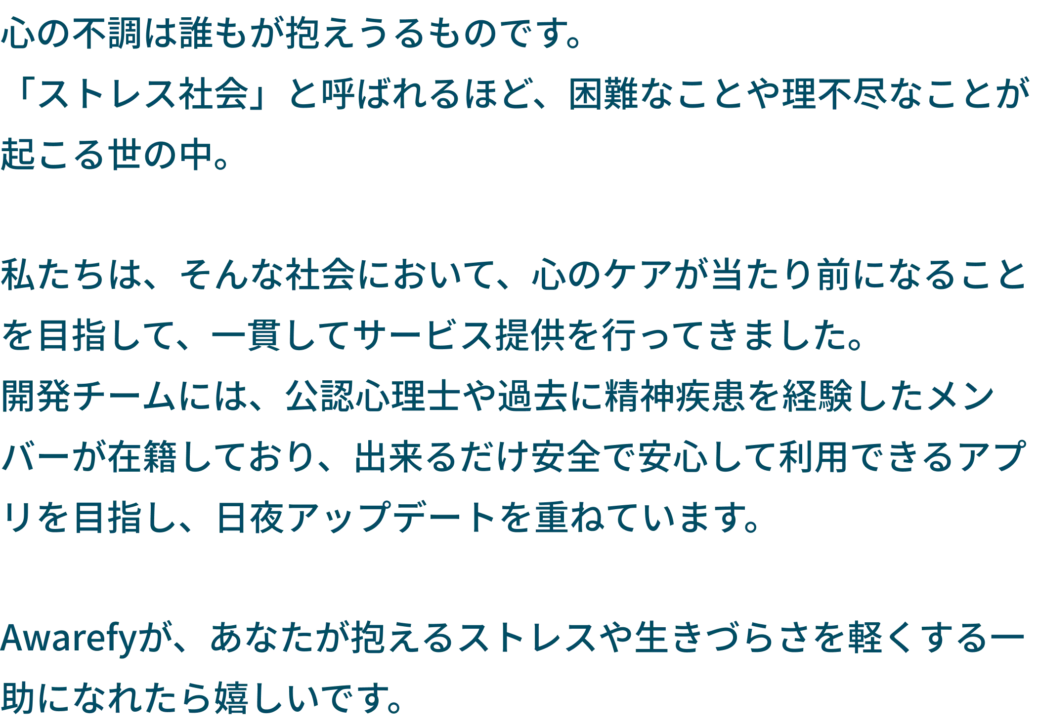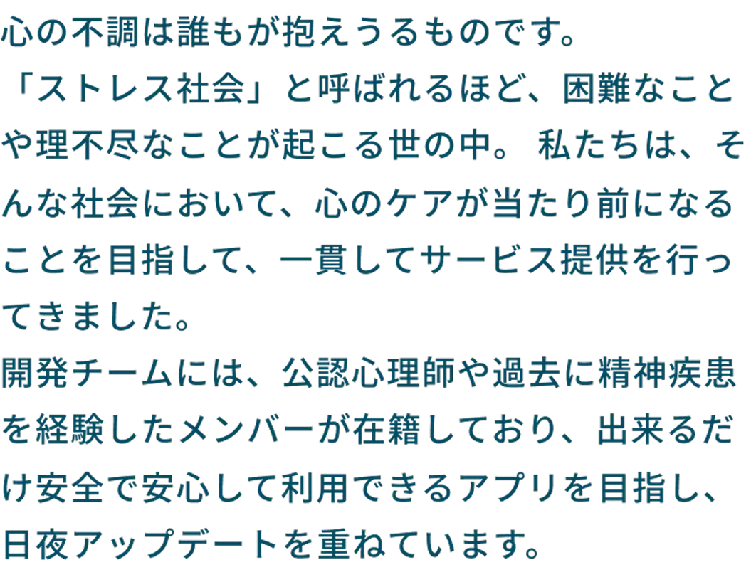 アプリは健康な人のメンタルヘルス維持のためにご利用いただくことを目的として作られています。あくまでセルフケアの用途でお使いいただくアプリのため、治療に代わるものではありません。治療中の疾患がある方は、主治医にご相談の上でご利用ください。