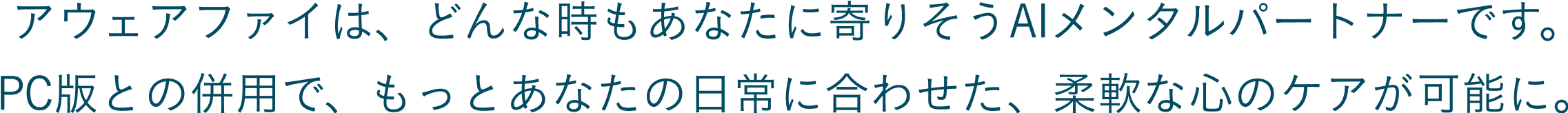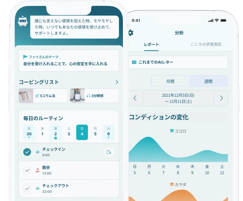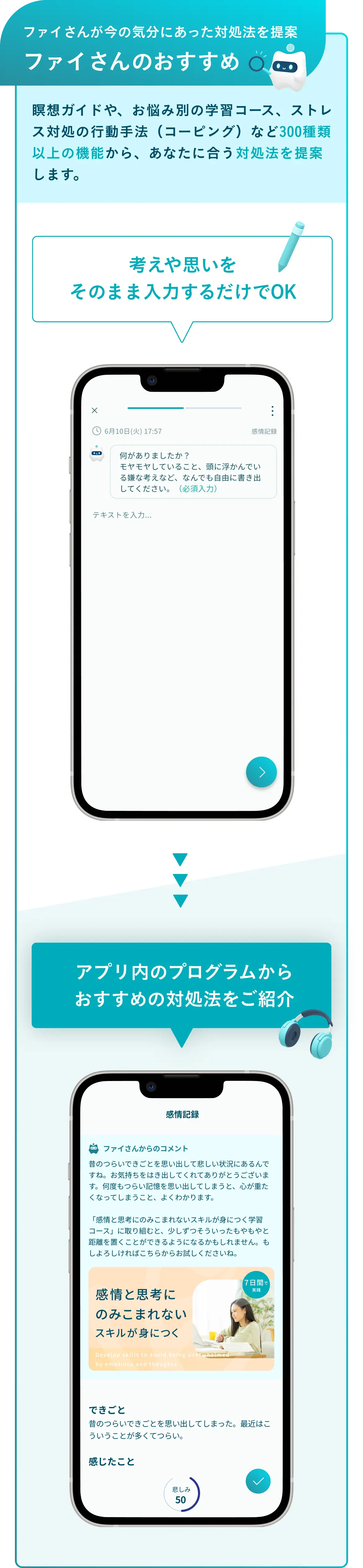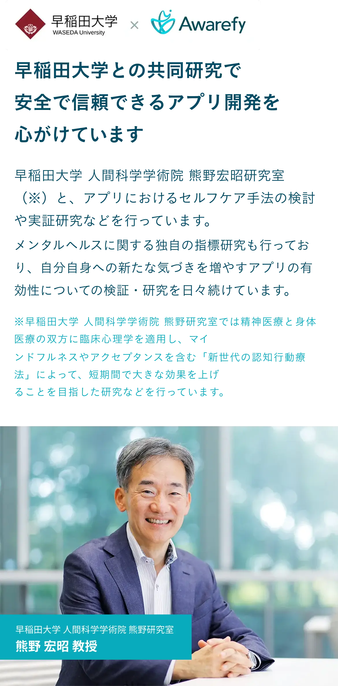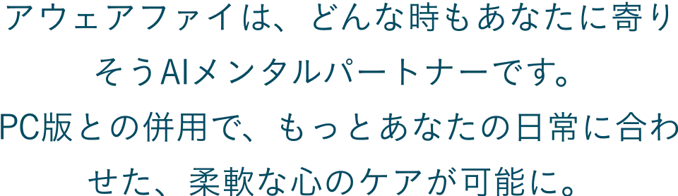 アプリは健康な人のメンタルヘルス維持のためにご利用いただくことを目的として作られています。あくまでセルフケアの用途でお使いいただくアプリのため、治療に代わるものではありません。治療中の疾患がある方は、主治医にご相談の上でご利用ください。